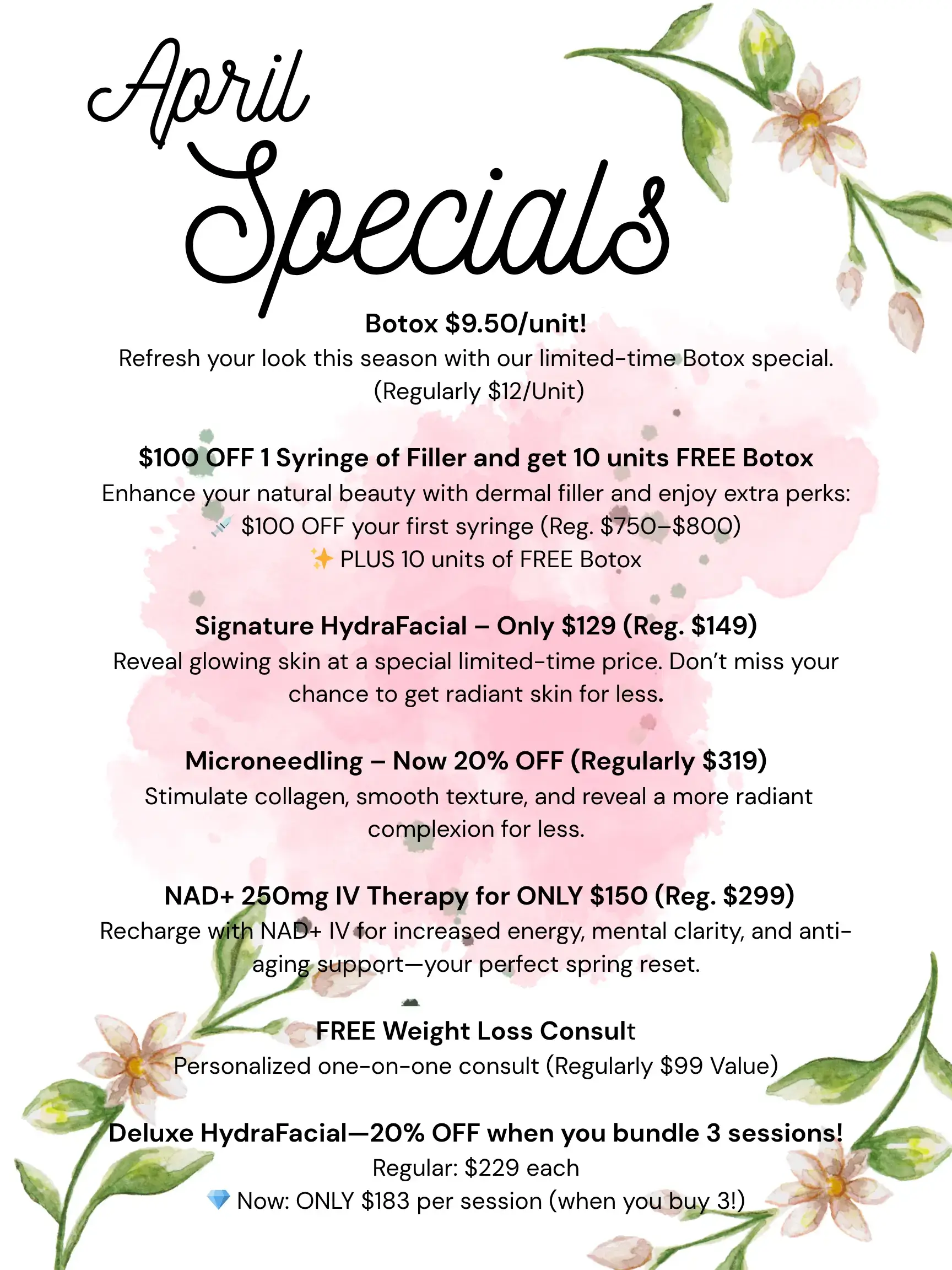 Refresh your look this season with our limited-time Botox special. (Regularly $12/Unit)$100 OFF 1 Syringe of Filler and get 10 units FREE Botox